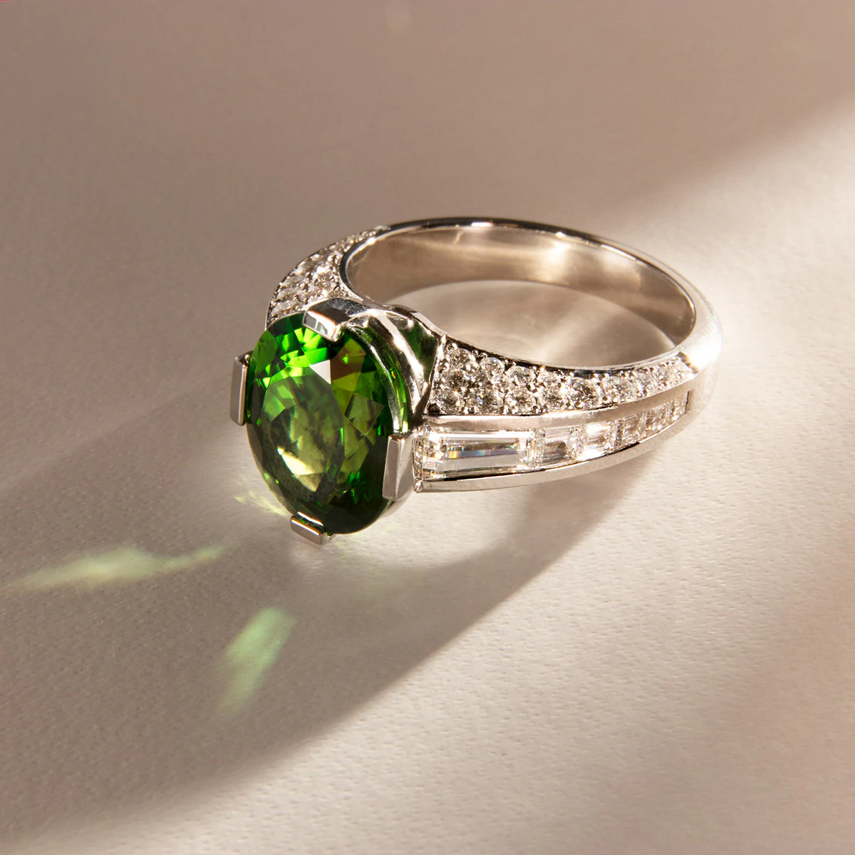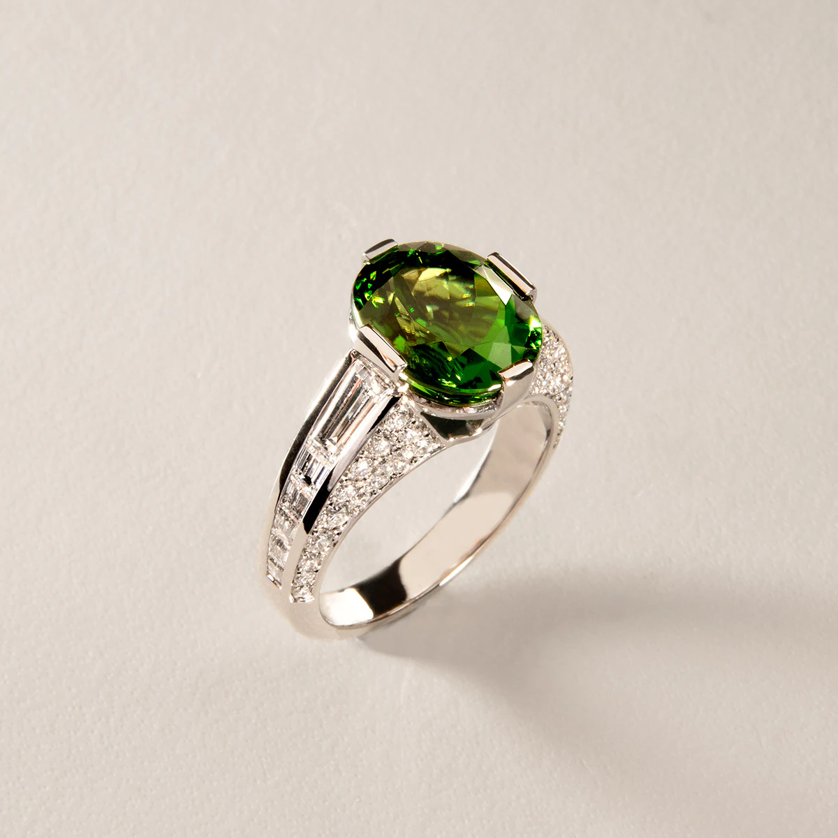 A covetable oval chrome tourmaline inspired the Sinatra cocktail ring. The 5.36ct gemstone has a deep green body, its splendour enhanced with baguette, trapezoid and carré-cut diamonds surrounded by round brilliant pavé-set diamonds.