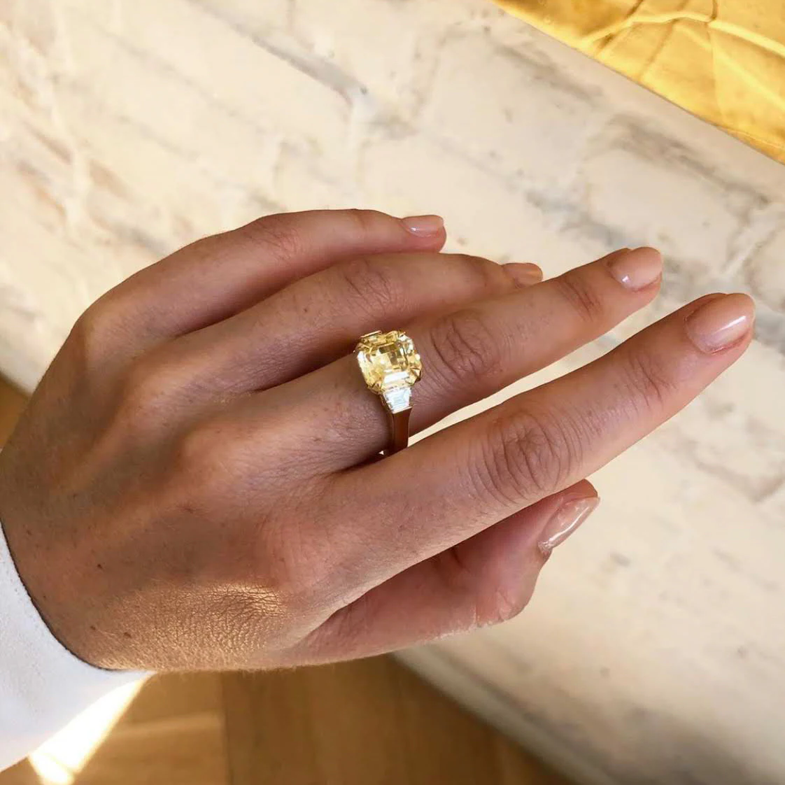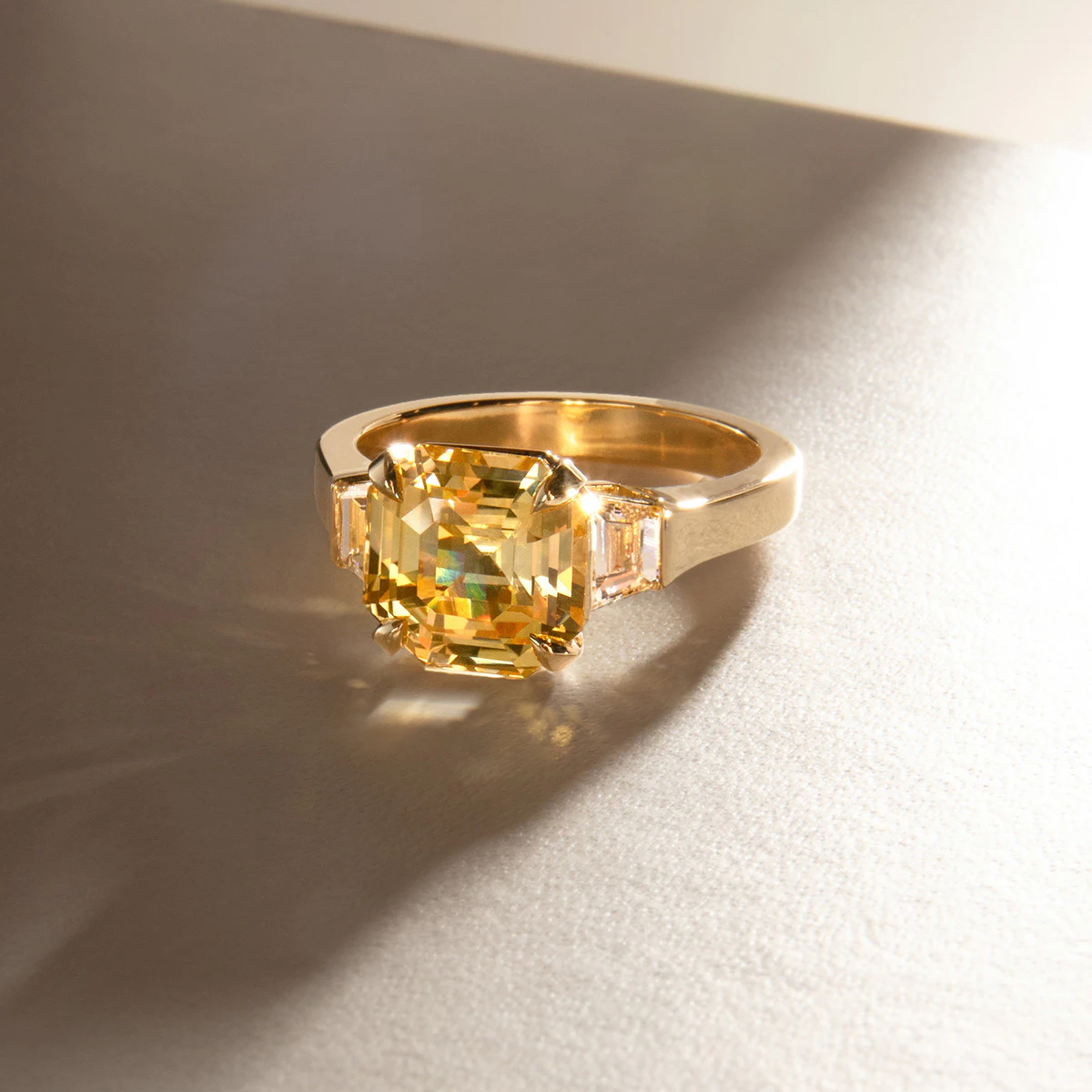 Showcasing a stunning 6.13ct Asscher-cut yellow sapphire, set in 18K yellow gold, the Valentin shines with all the warmth and radiance of the sun. Bringing beautiful Art Deco accents to a modern silhouette, its subtle colour and form suit both day and evening wear.